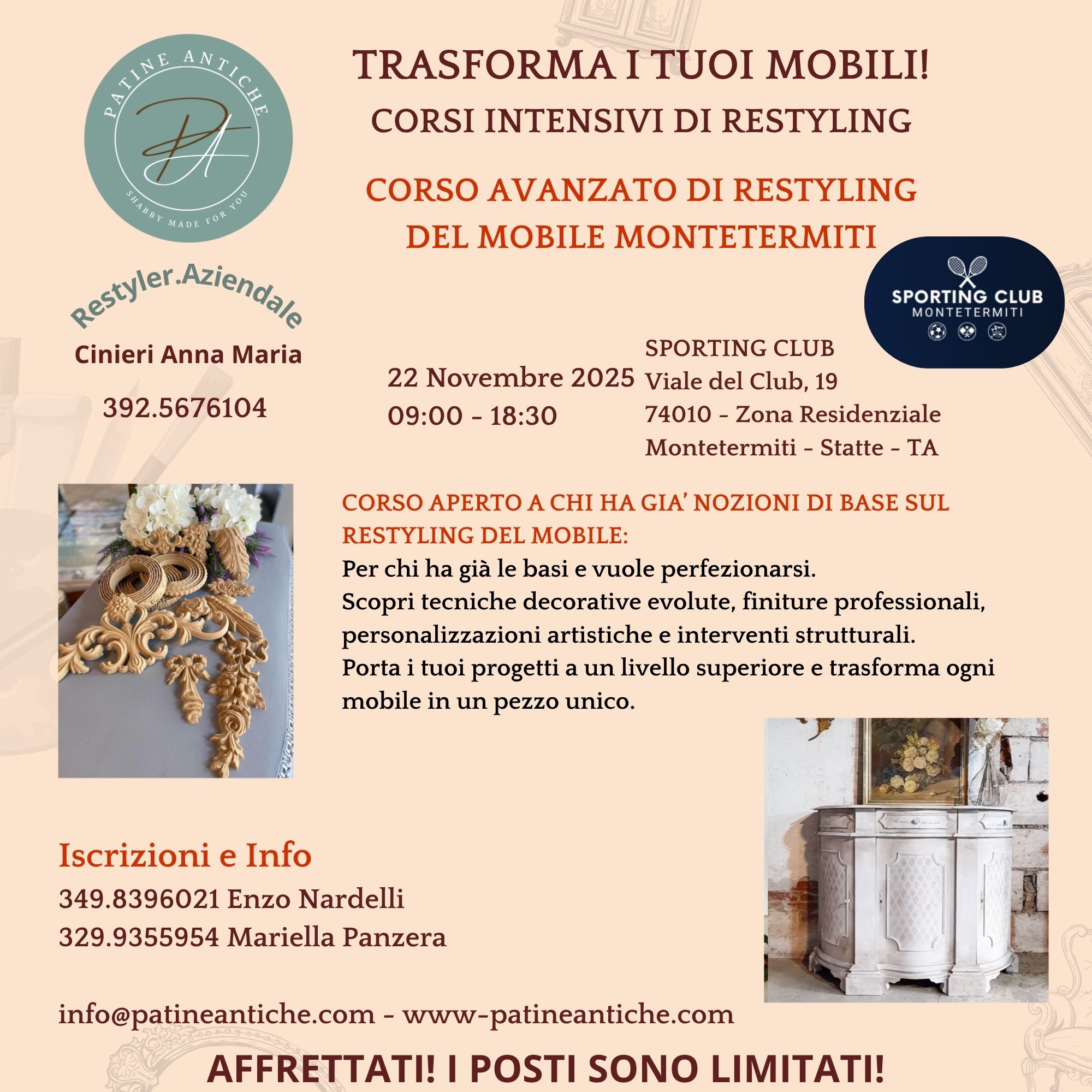 Obiettivi del corso – portare gli allievi, che hanno già una base di conoscenze o hanno frequentato un corso base, a padroneggiare tecniche più complesse e specializzate per la trasformazione e la decorazione dei mobili