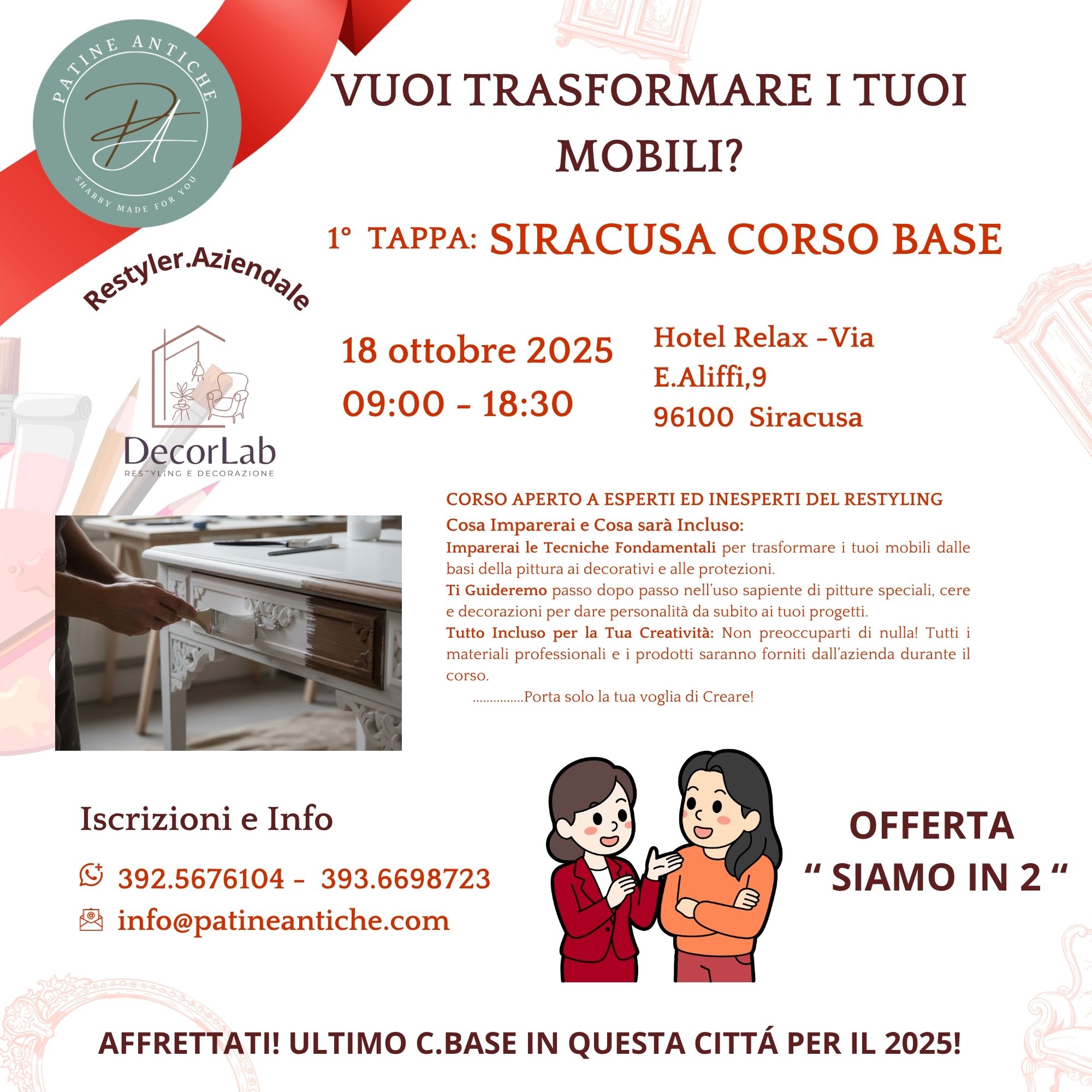 Corso Base di Restyling del Mobile SIRACUSA Edizione Itinerante – Offerta “Siamo in Due!” 231,80